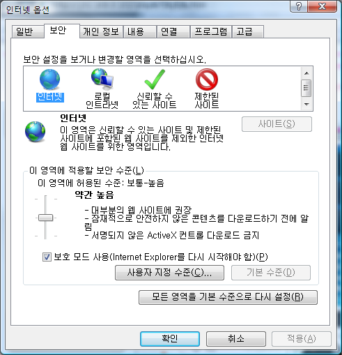 ① IE 실행>도구>인터넷옵션>보안에서 [보호 모드 사용(Internet Explorer를 다시 시작해야 함)]이 체크되어 있다면 해제해 주세요.