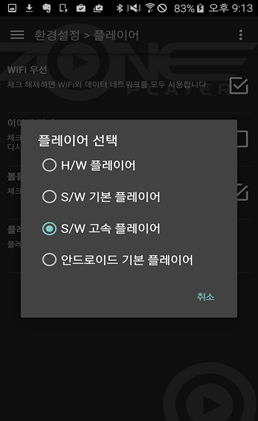 이후 “플레이어” -> “플레이어 선택”을 터치하신 후 “S/W 고속 플레이어”를 선택하시면 원할한 동영상 수강이 가능합니다.